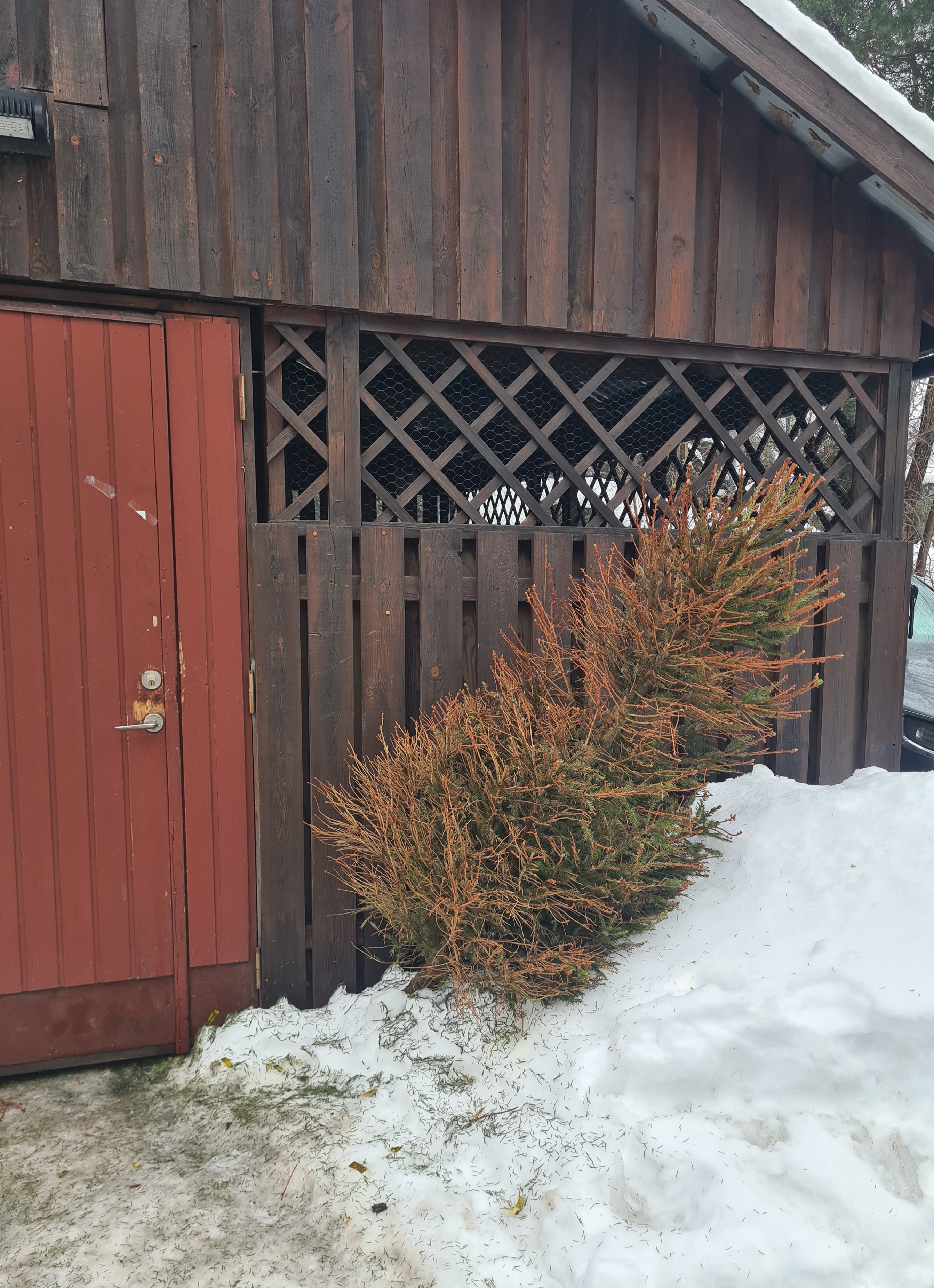 Någon har ställt en julgran utanför soprummet. Detta är inte rätt plats för sådant och inte något som sophanteringen kommer ombesörja. Du som placerat din gran där ombeds att ta hand om denna och göra dig av med den på ett korrekt sätt.